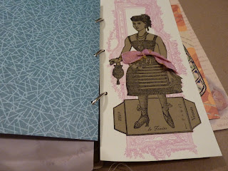 I made a mold with Sculpey clay from a very small frozen charlotte. I glazed her to give her a polished finished and glued her into the niche. I added some bling, lace, small piece of black paper with numbers and a burgundy paper flower. A small bow was added to the opposite page. Now, that's the smallest altered book I've seen...makes me want to find more of these mini books.